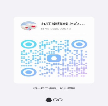 1、网络心理辅导服务。QQ:362200648(九江学院线上心理辅导服务群),线上为主,自主预约。识别下方二维码进入QQ群,进群前请备注“学院+班级+姓名+联系方式”,咨询方式可以选择视频、语音或文字,由咨询师与来访者共同商定。